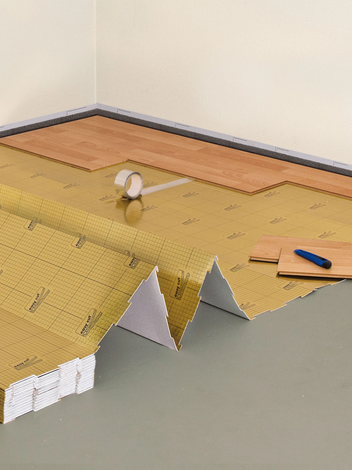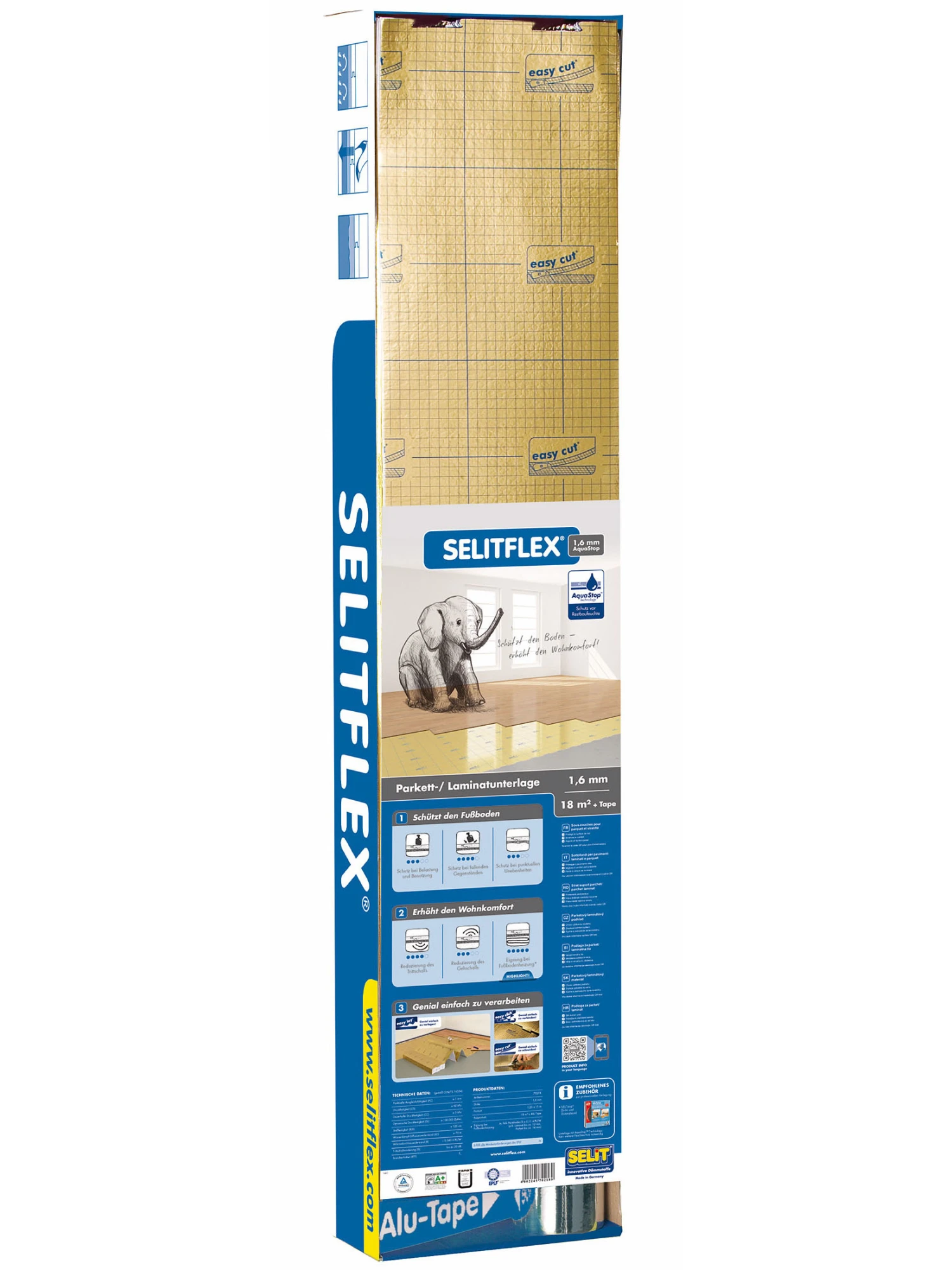 Dämmunterlage für die schwimmende Verlegung von Parkett- / Laminatböden. Ideal bei vorhandener Fußbodenheizung. Lässt die Wärme der Fußbodenheizung optimal passieren. AquaStopTM-Oberfläche für einen sicheren Schutz vor Feuchte aus dem Untergrund. Sehr gute Tritt- und Gehschallreduzierung. Gute Druckstabilität für dauerhaften Schutz bei hoher Belastung und Benutzung. Zuverlässiger Schutz des Bodens bei Stoßbeanspruchungen durch fallende Gegenstände. easy lay®: Als Faltplatte genial einfach zu verlegen easy click®: Mit Klicksystem genial einfach zu verbinden easy cut®: Mit aufgedrucktem Raster genial einfach zu schneiden Stärke: ca. 1,6 mm, Format: ca. 1 x 15 m, Inhalt: ca. 15 m² + Tape.