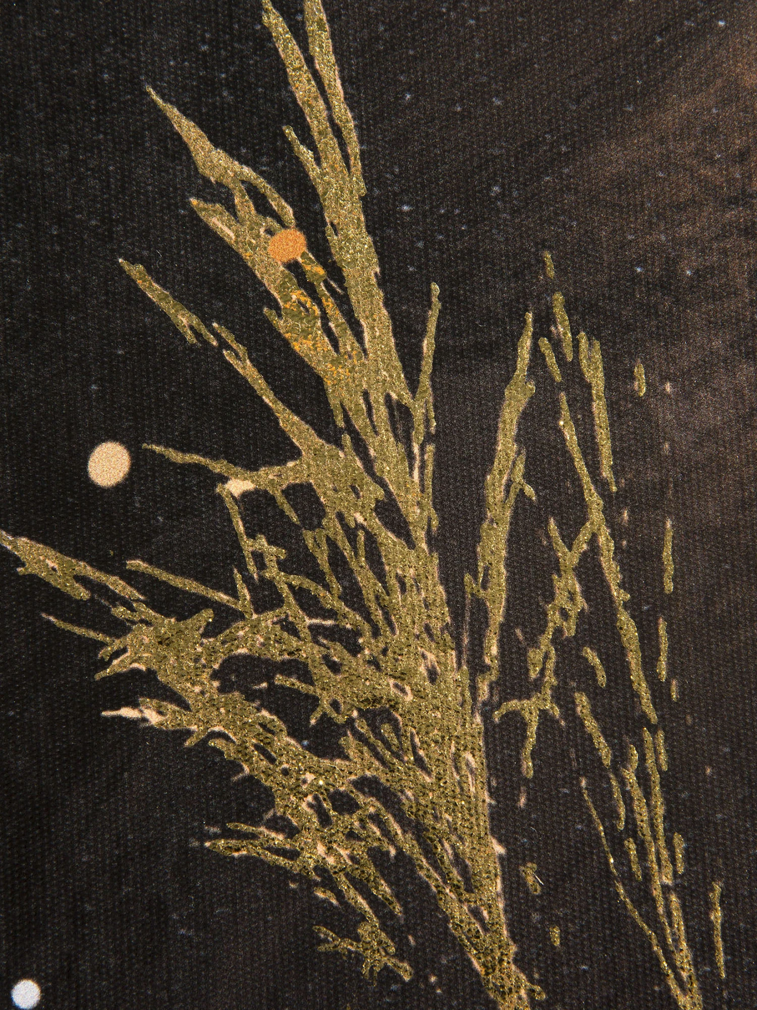 Majestätisches Löwen-Motiv vor dunklem Hintergrund auf Leinwand. Gras aus Goldfolie.